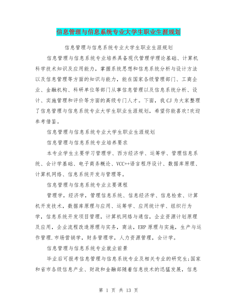 信 息 专 业 毕 业 生 五 年 职 业 规 划