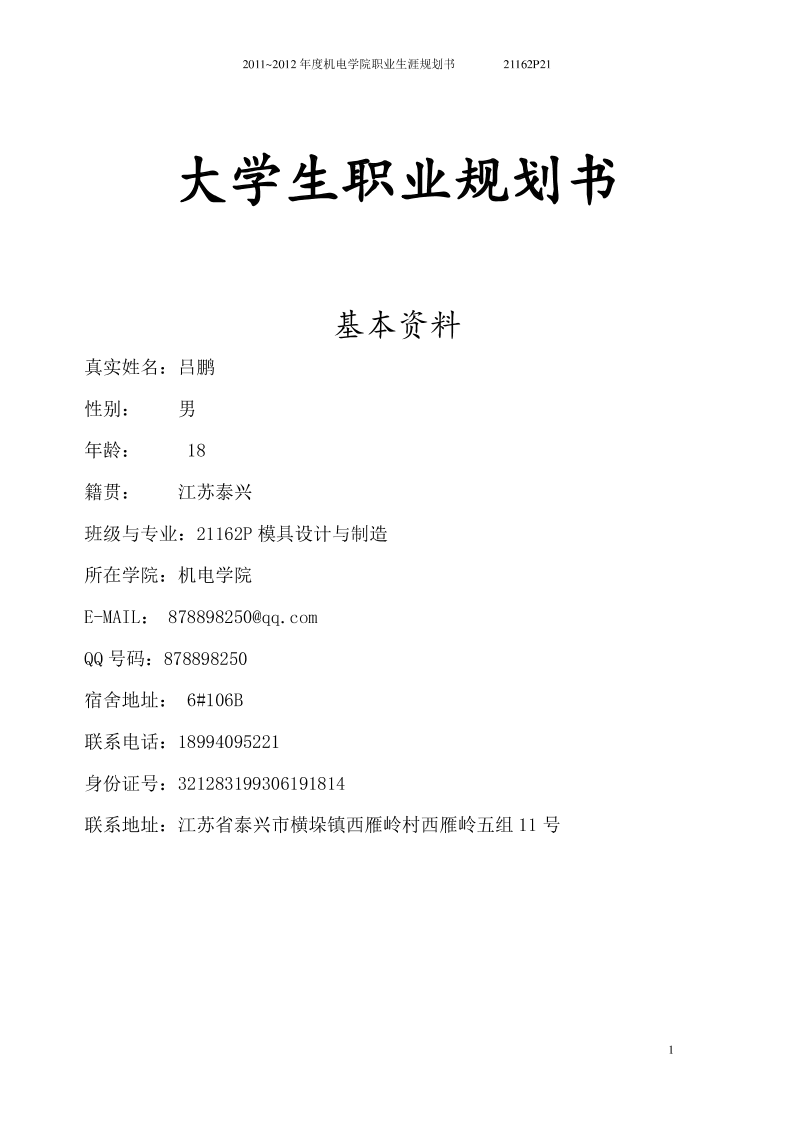 大学生职业生涯规划书(模具设计与制造)